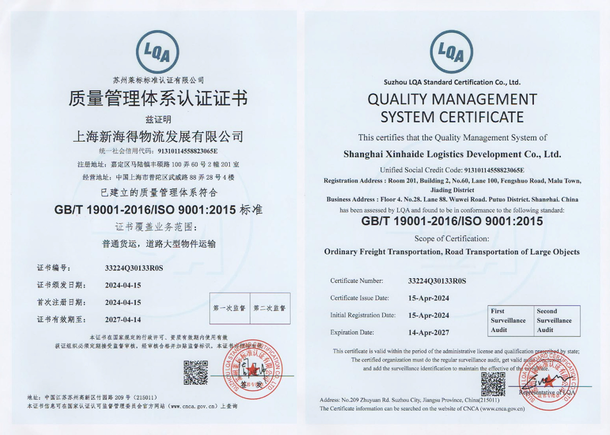 新海得物流嚴格按現代物流操作流程進行標準化運作。已通過國際質量管理體系ISO9001:2015體系認證。運用健全的客戶服務管理系統、車輛管理系統,財務管理系統。在查詢、監(jiān)控、追蹤、結算等方面與客戶做到無縫對接,打造了專業高效的客戶服務體系。